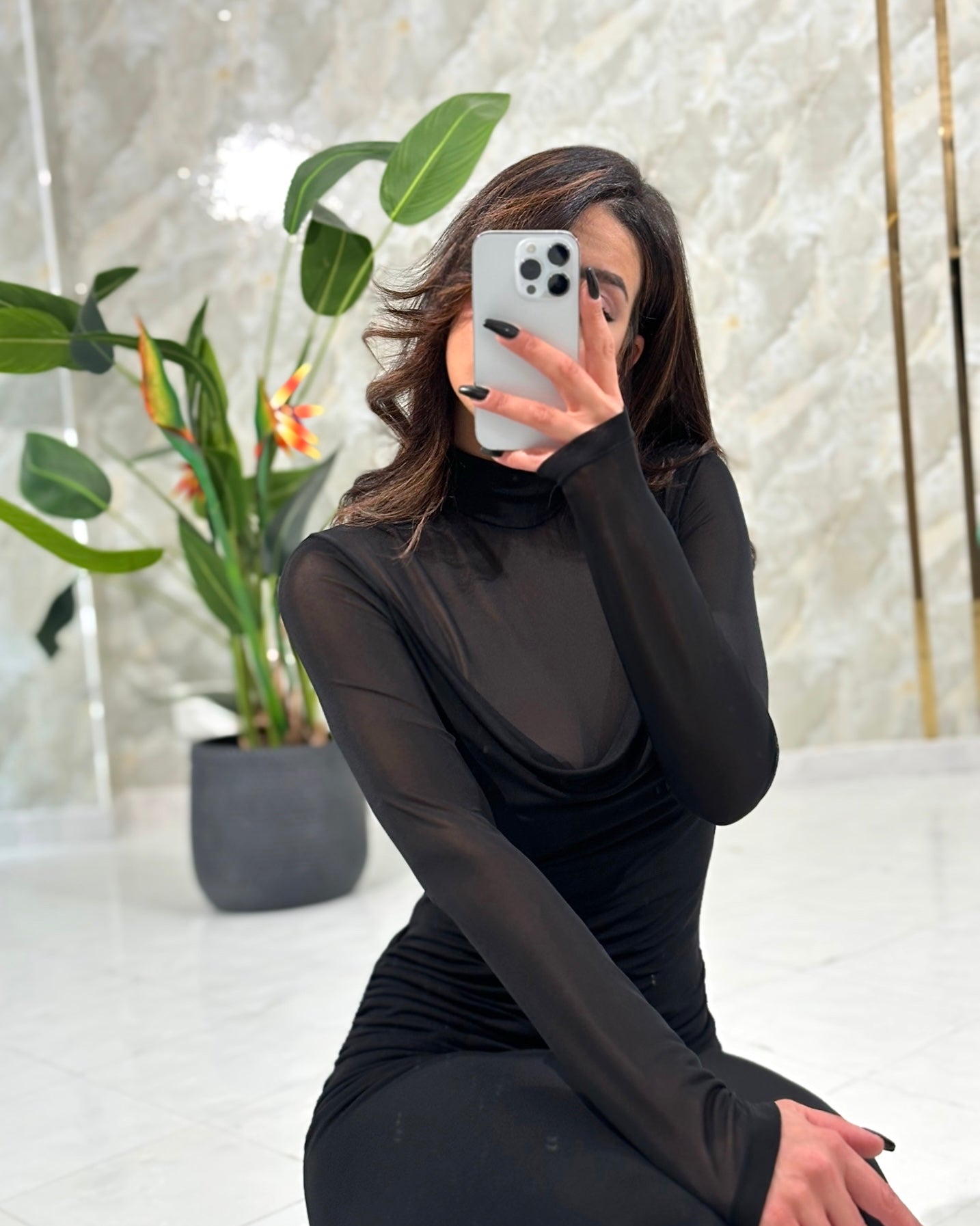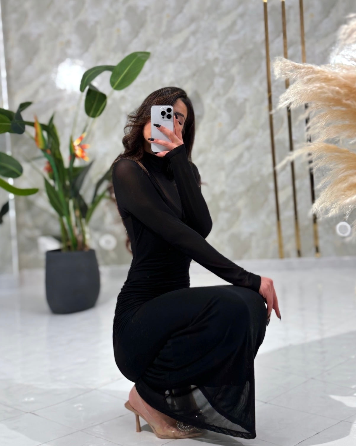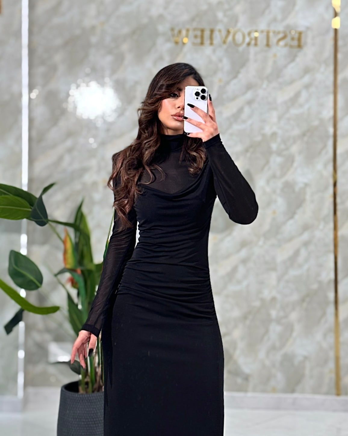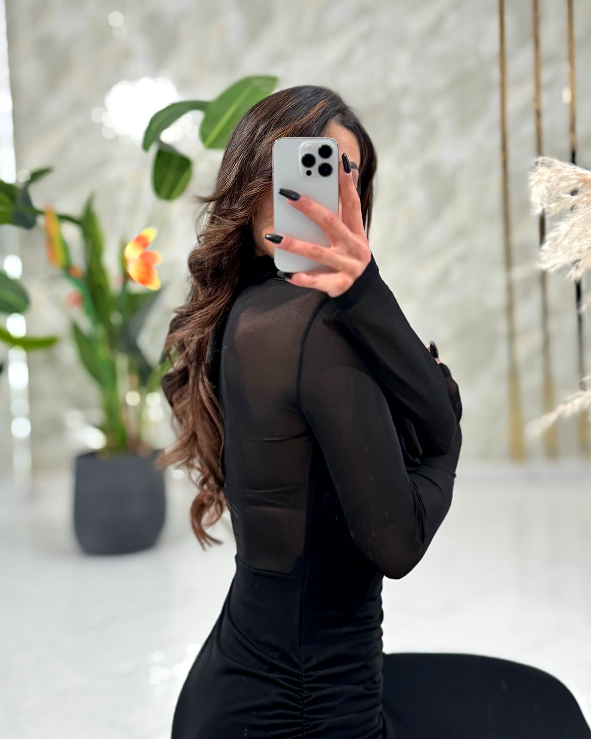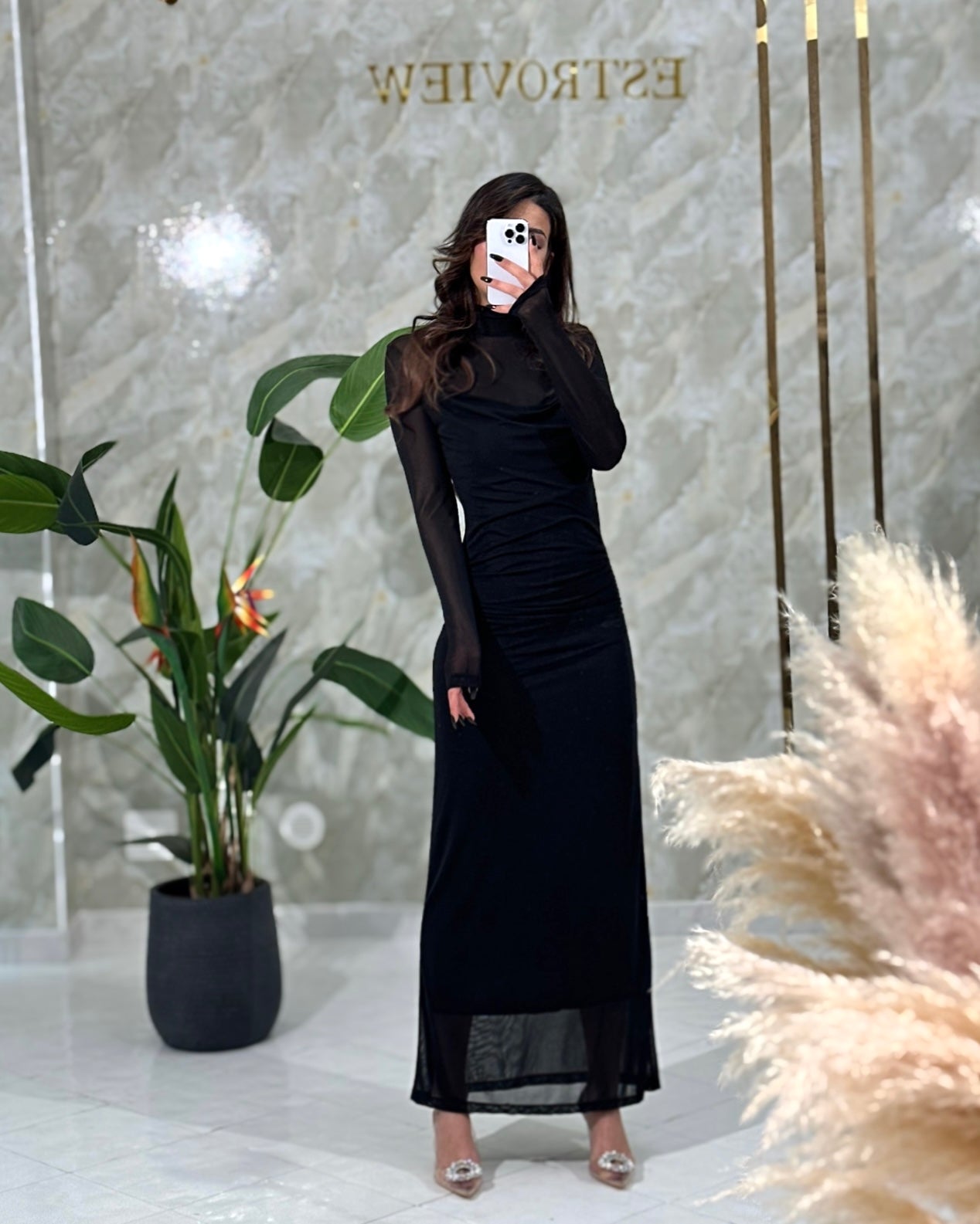 Abito lungo con trasparenze sul décolleté,braccia e schiena.