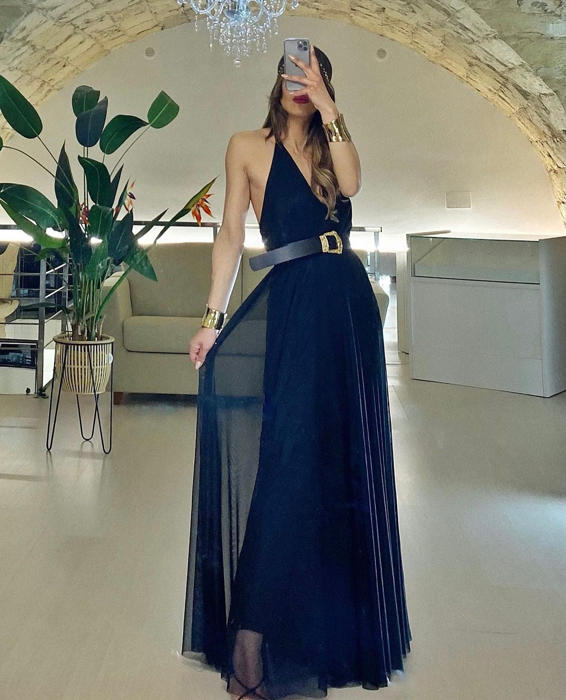 Abito lungo nero in tulle legato alla nuca con scollo a V,elastico in vita e cintura in ecopelle inclusa.