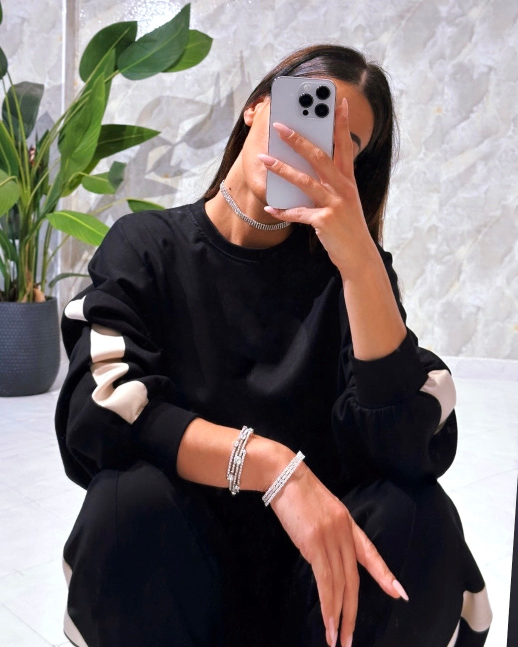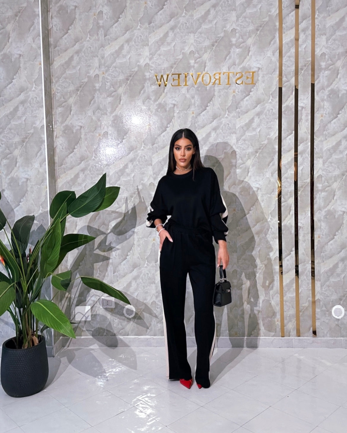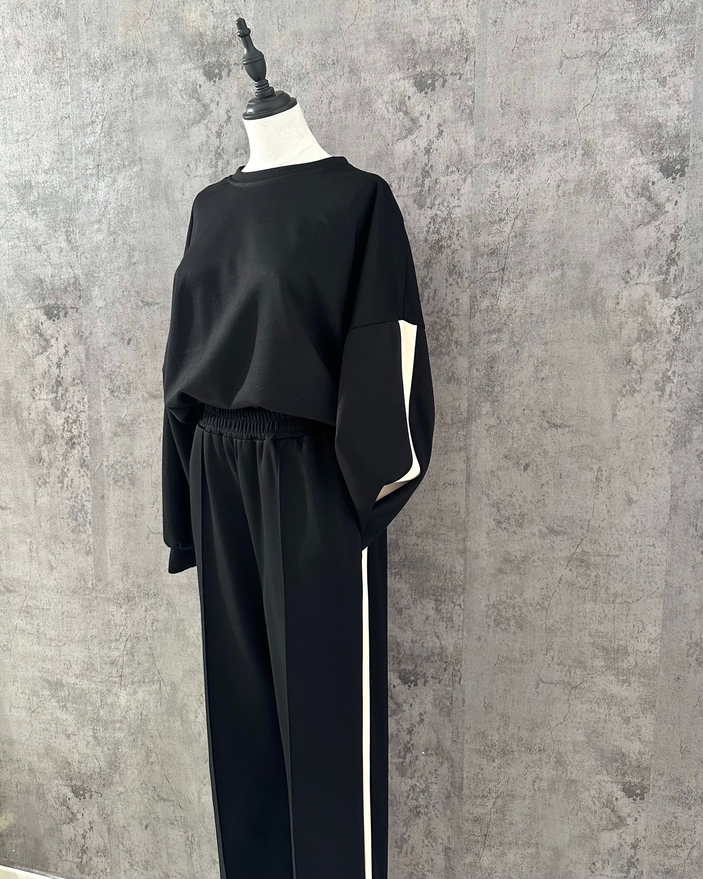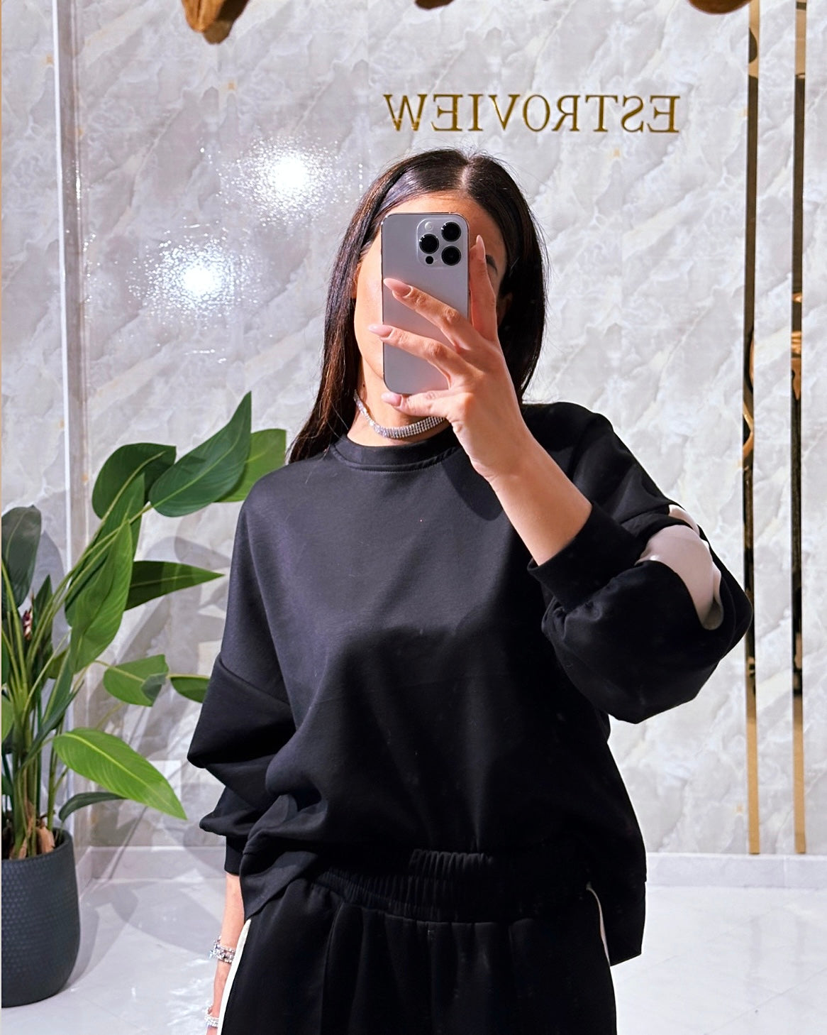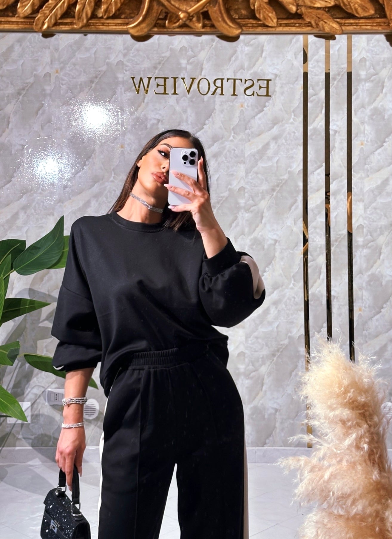 La felpa è ampia e comoda, il pantalone è un modello palazzo a vita alta con elastico in vita e tasche America sui fianchi.
