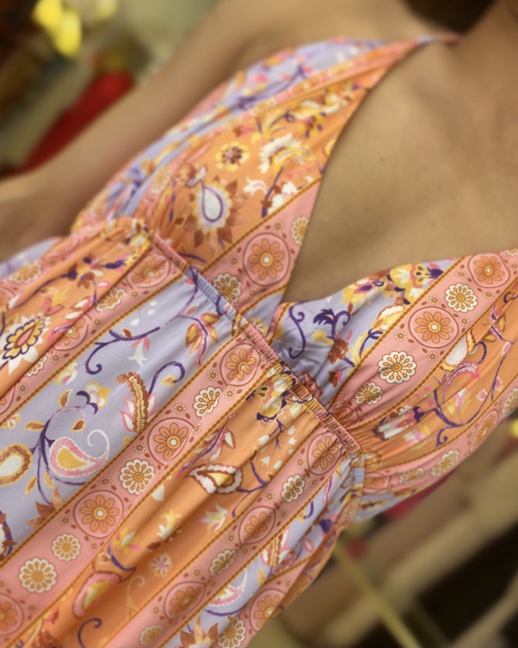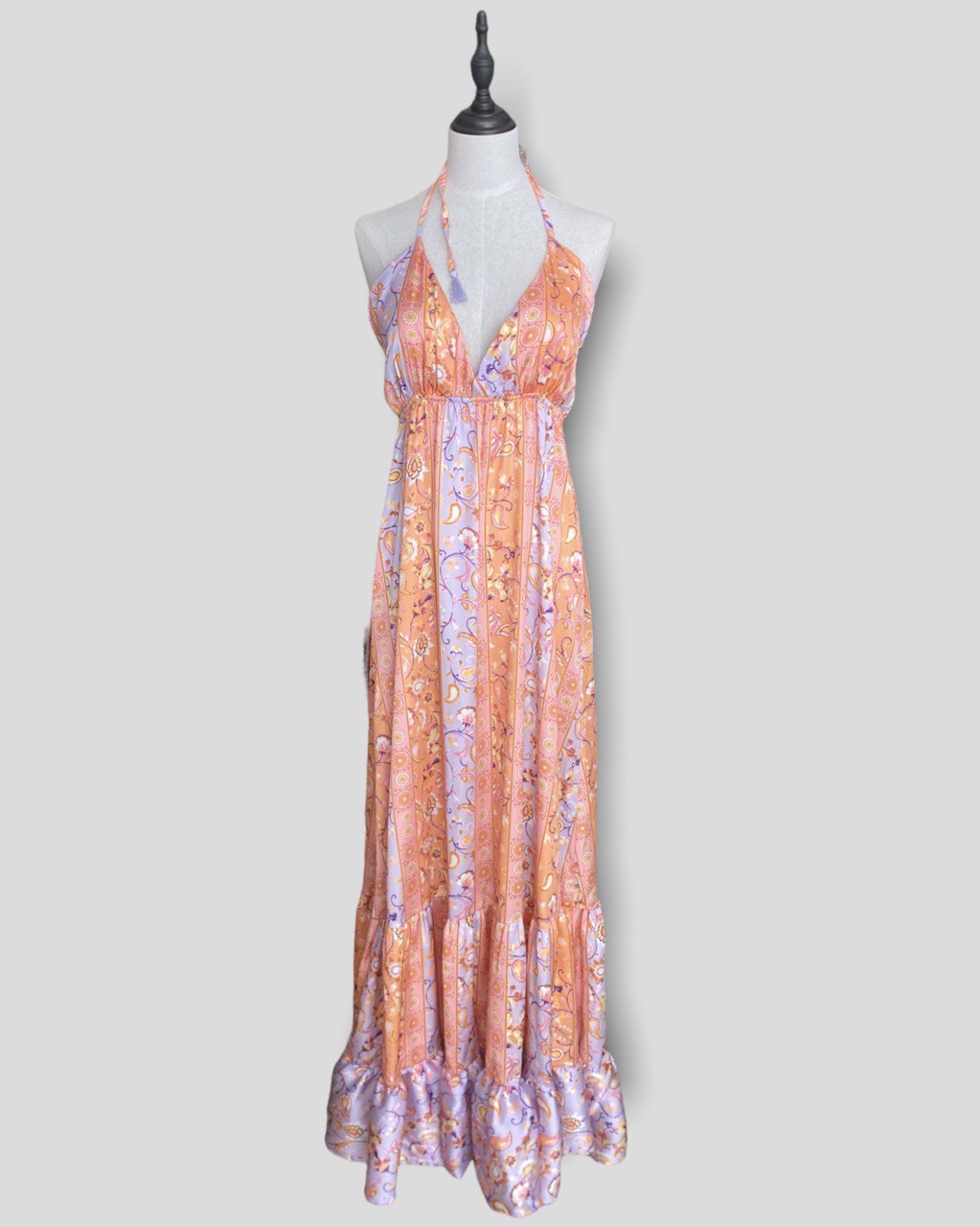 Abito lungo con scollo a V,elastico in vita.Stampa floreale che va sui toni dell'arancio e del glicine.Si regola tramite dei lacci che si annodano al collo e alla schiena.