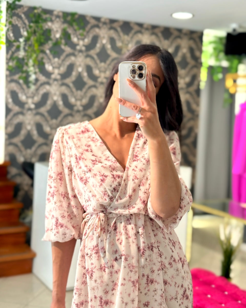 Mini abito con stampa floreale,scollo incrociato,manica ampia con elastico sul polsino e in vita.