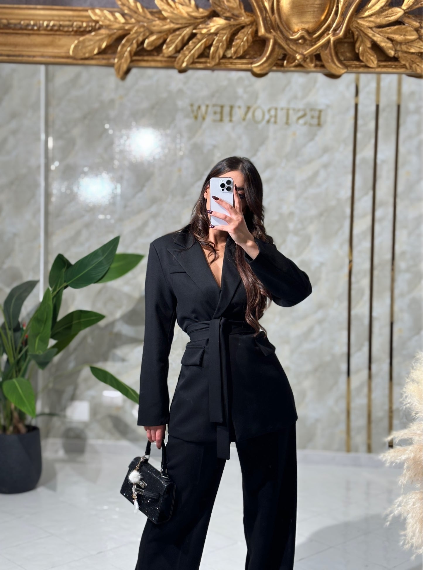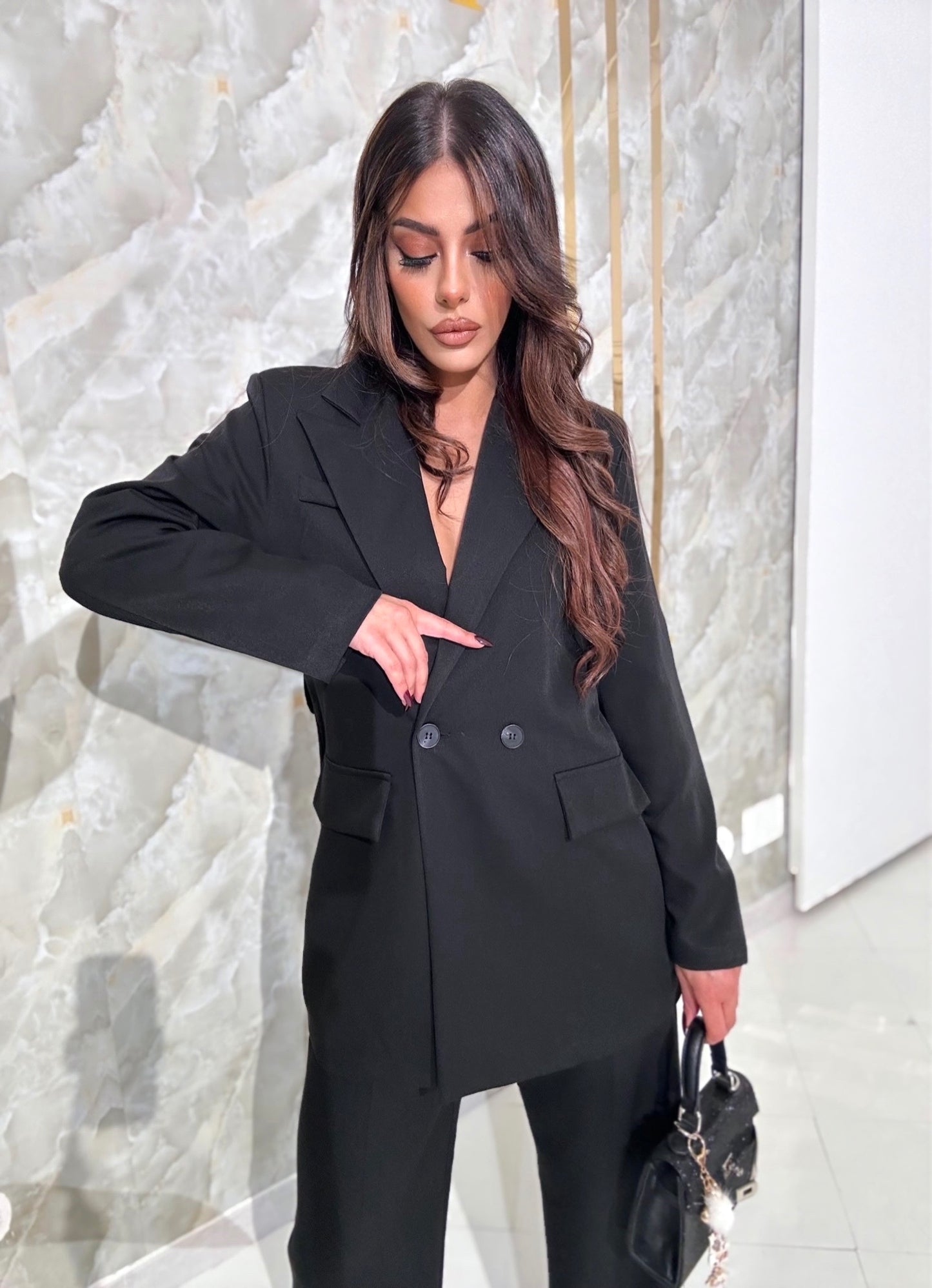 •Giacca modello oversize dal taglio morderno,doppio petto con fusciacca e bottoni tono su tono.