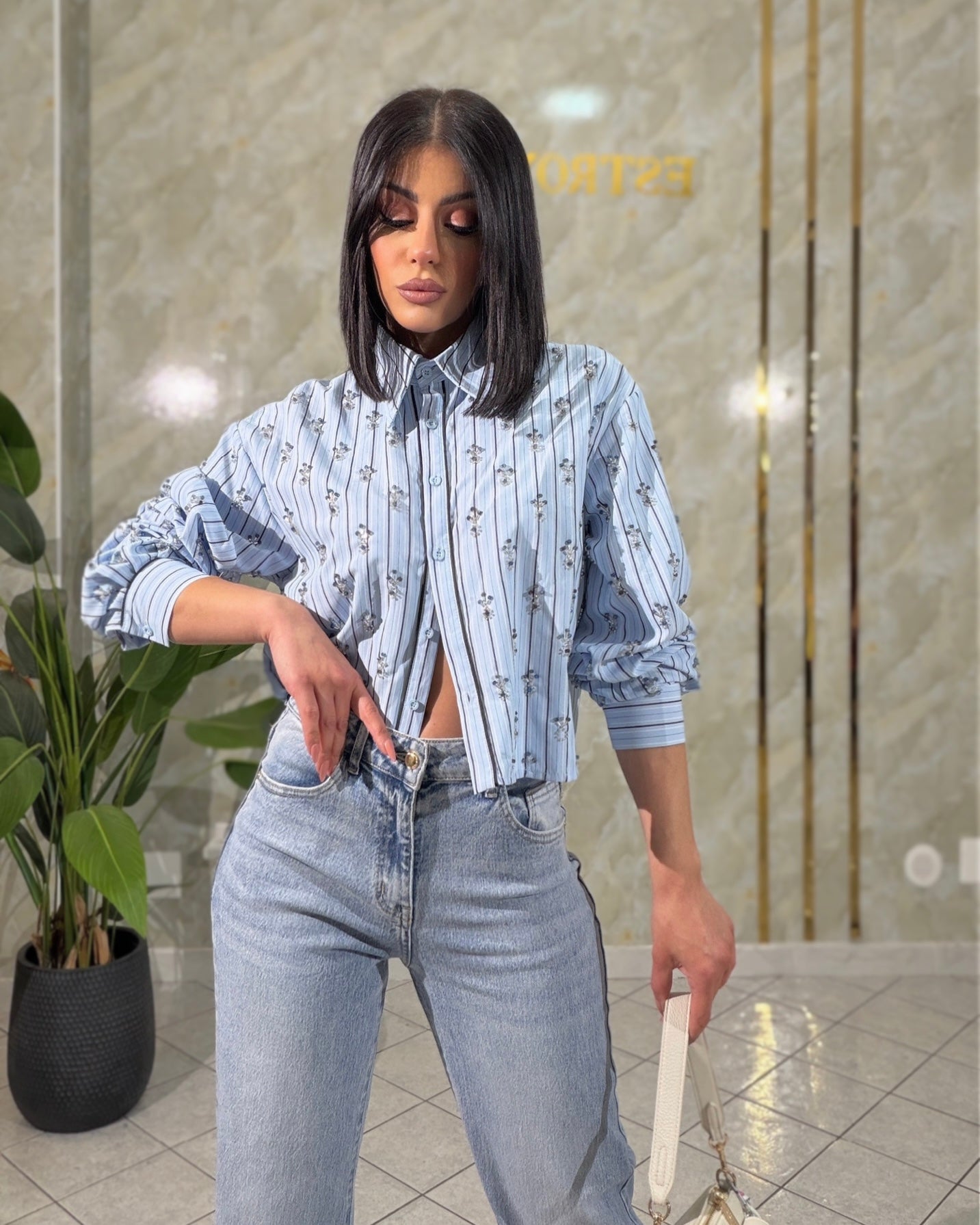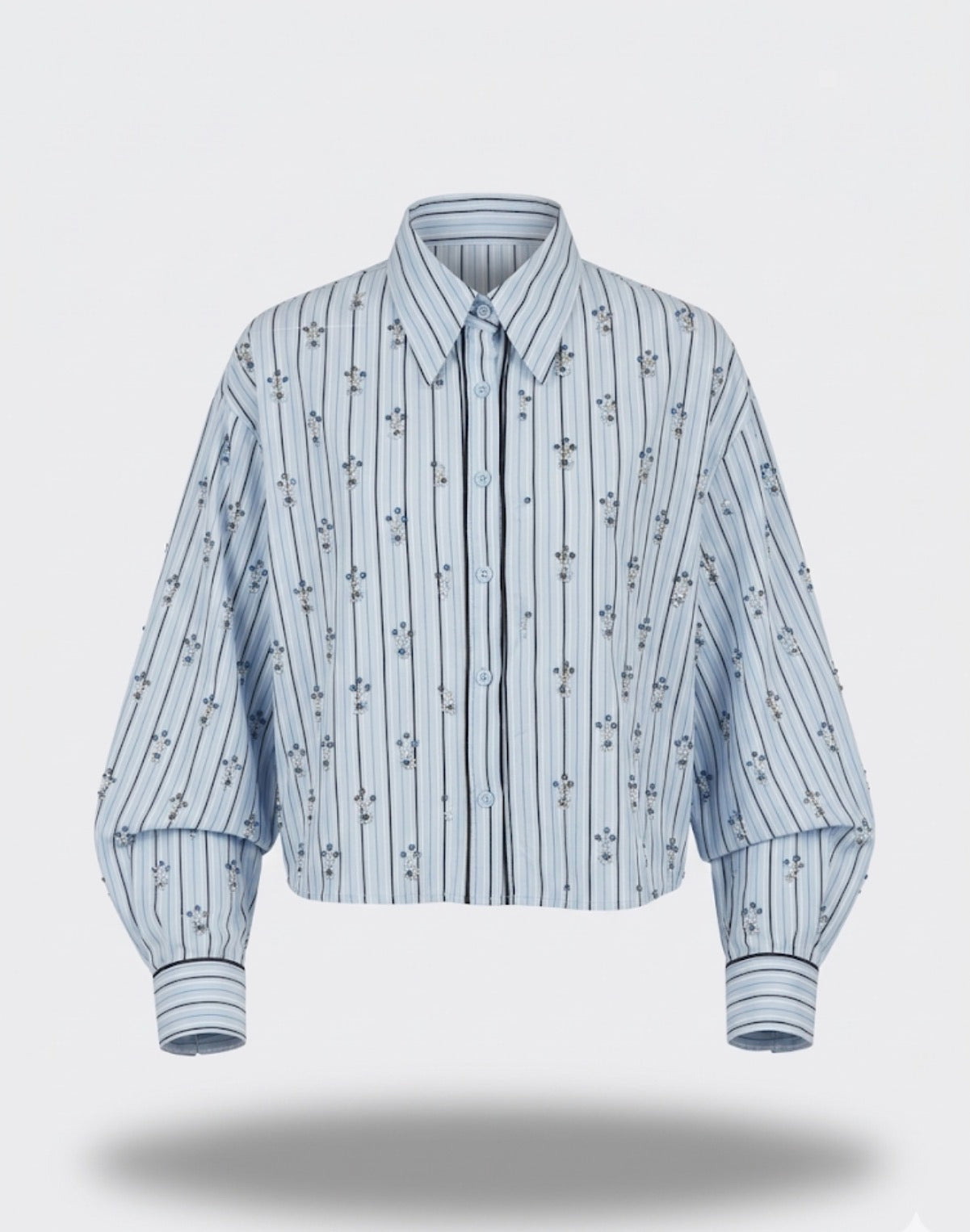 Camicia cropped, tinta unita a righe nere con cristallini.