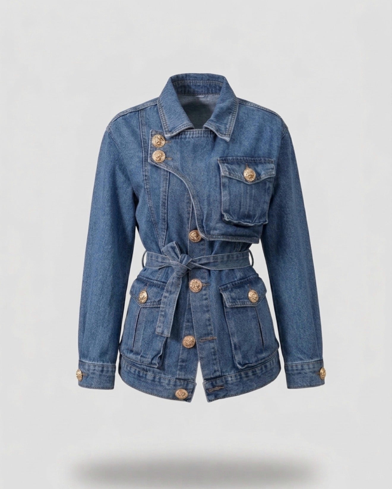 Giacca in denim con tasconi, fusciacca in vita e bottoni oro.