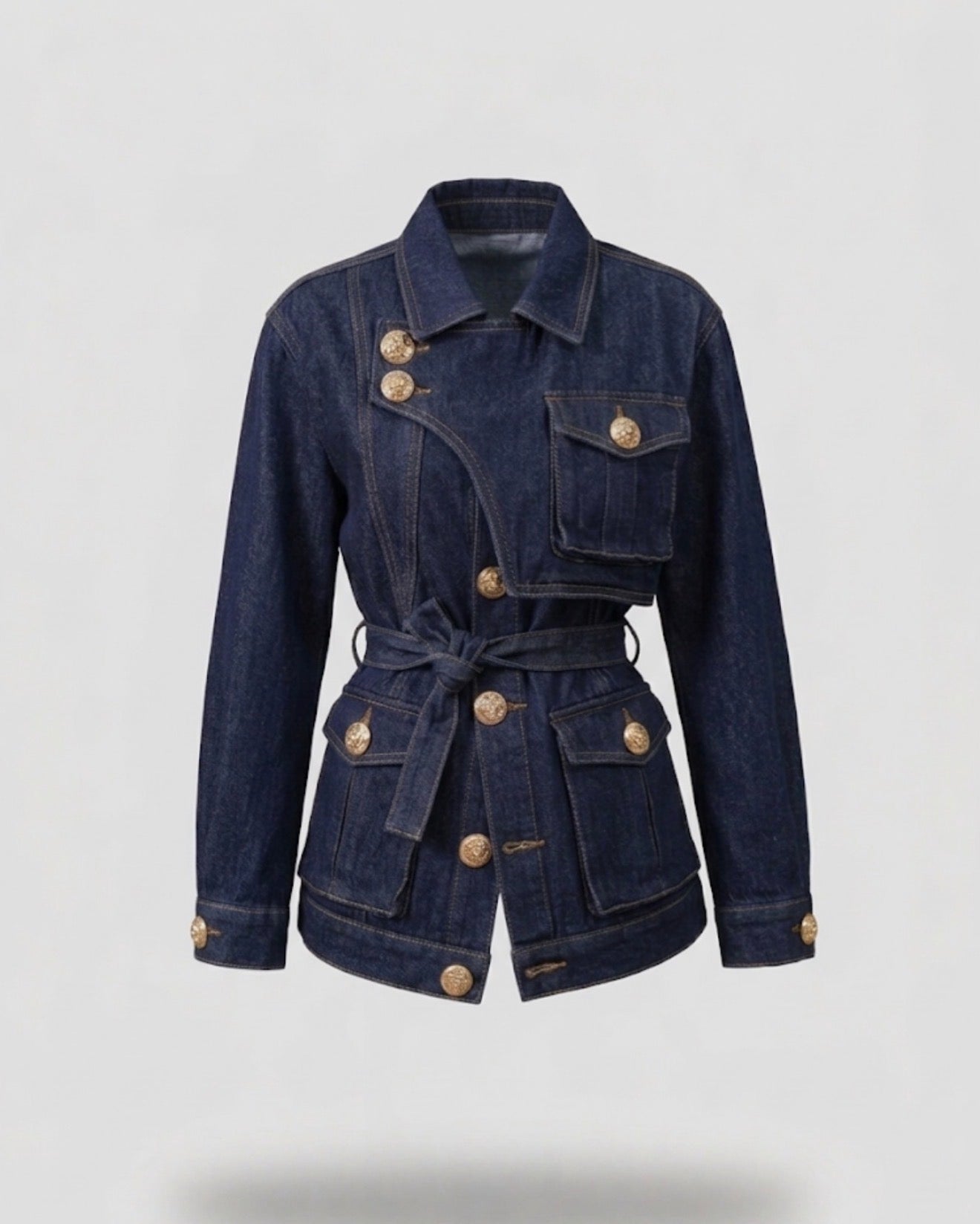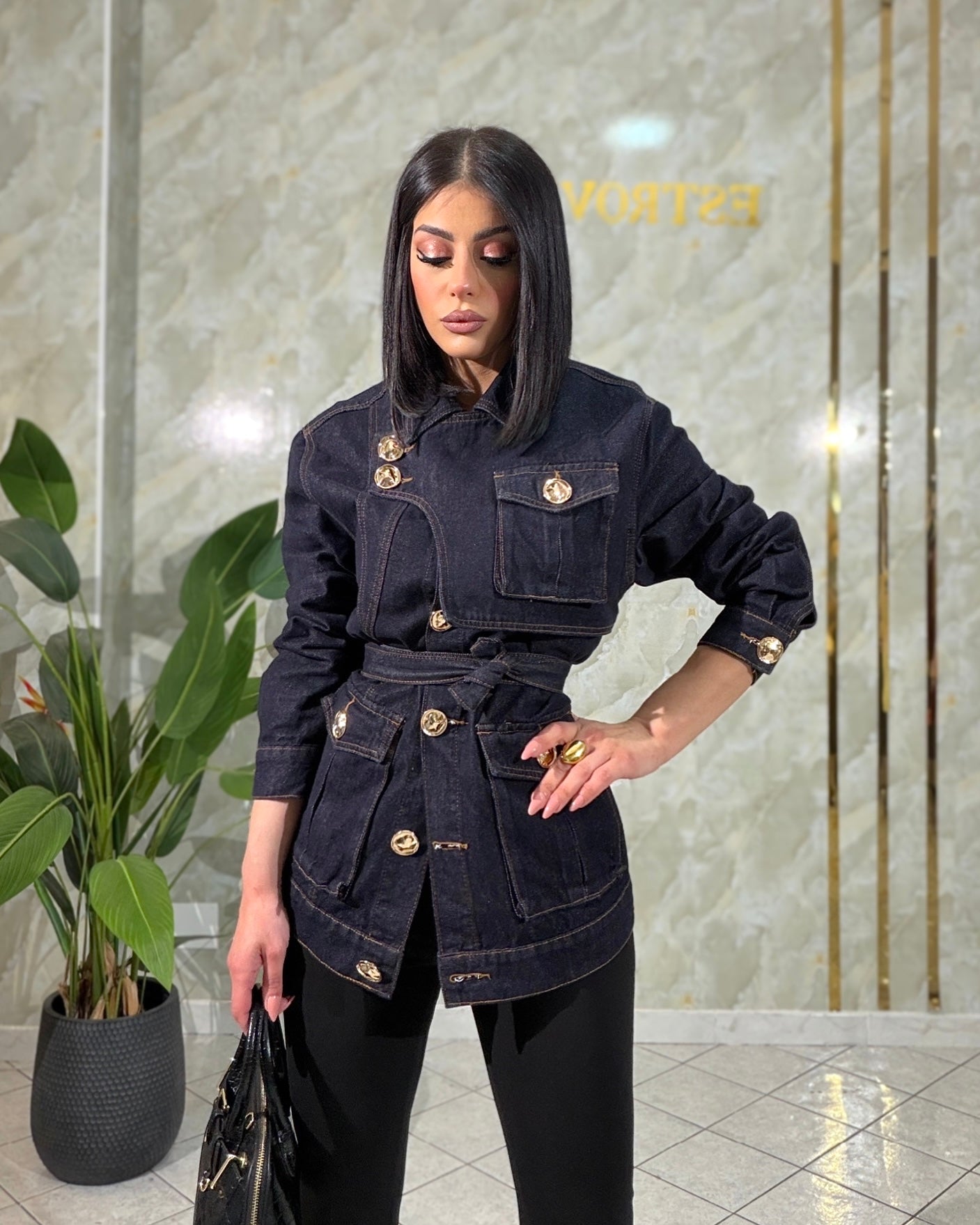Giacca in denim con tasconi, fusciacca in vita e bottoni oro.
