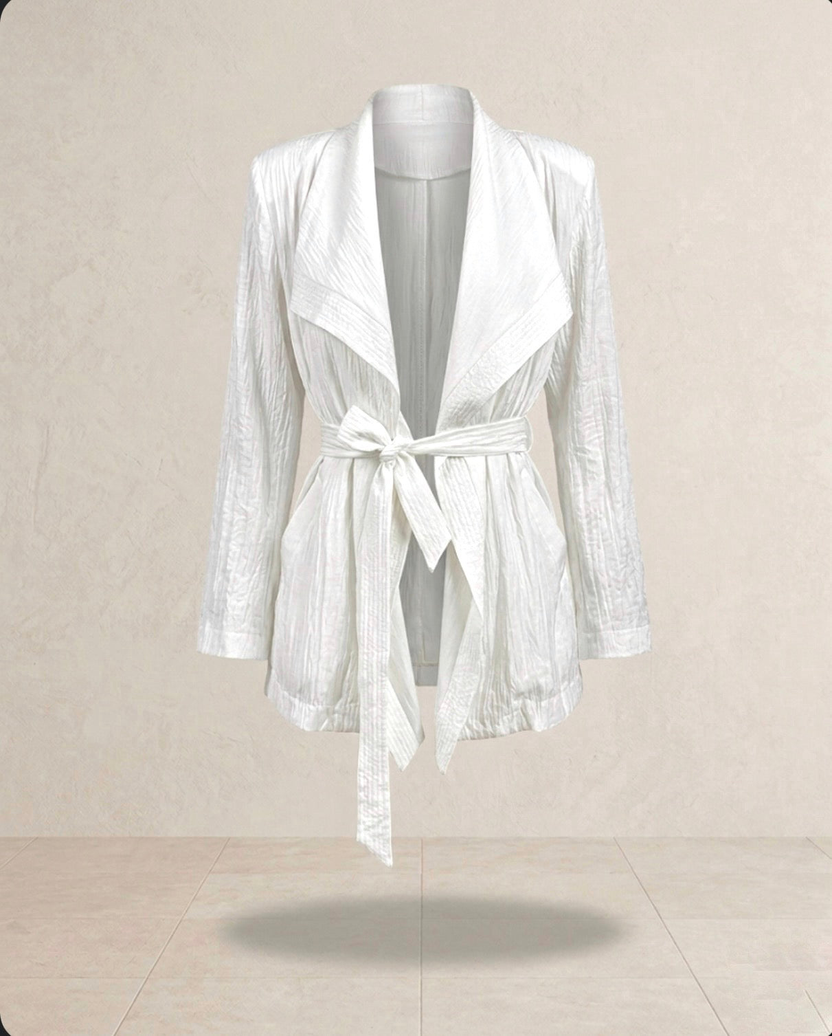 Giacca Leggera con spallina imbottita, colletto ampio, media lunghezza e cinturino in vita.