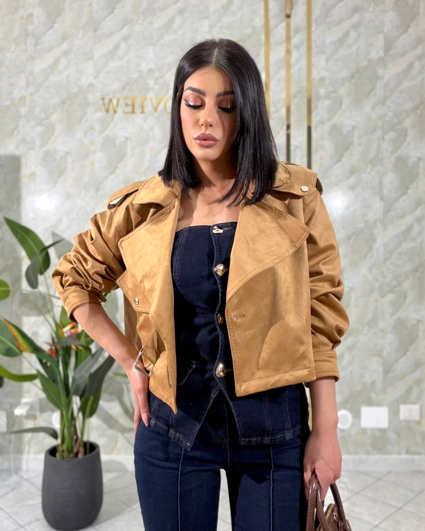 Giacca in suede, modello trench, metalleria oro, chiusura con cinturino a lato.