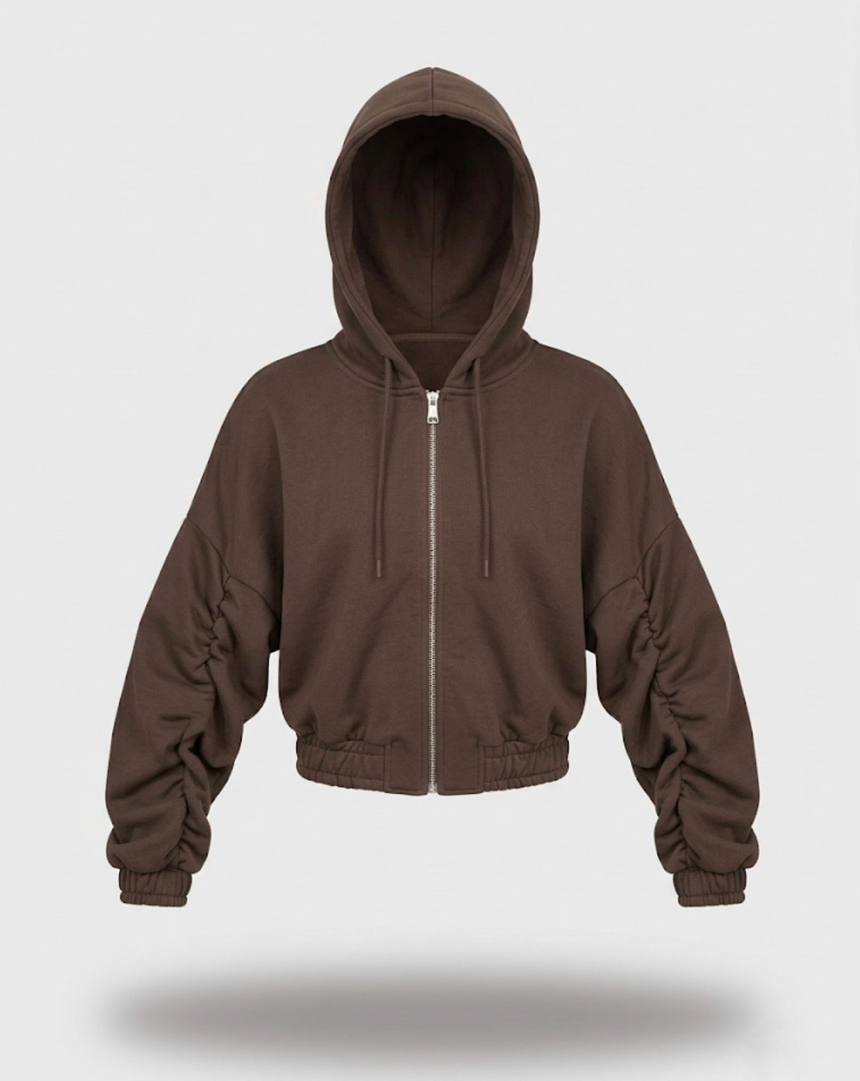 Felpa con cappuccio, zip e manica ampia arricciata.