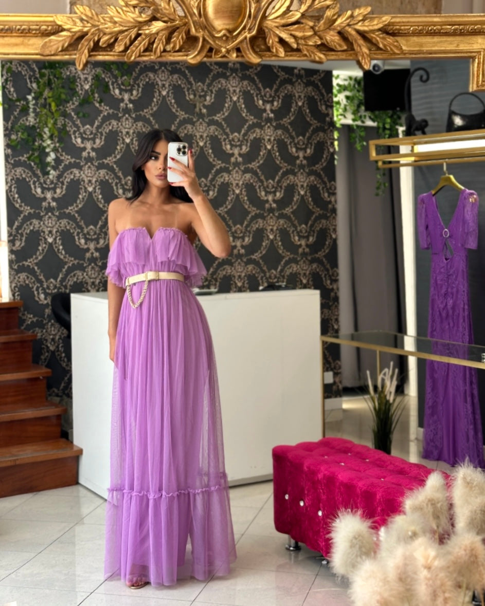 Abito lungo in tulle,scollo retto con una piccola apertura a V centrale,balza sul décolleté e a fondo gonna.