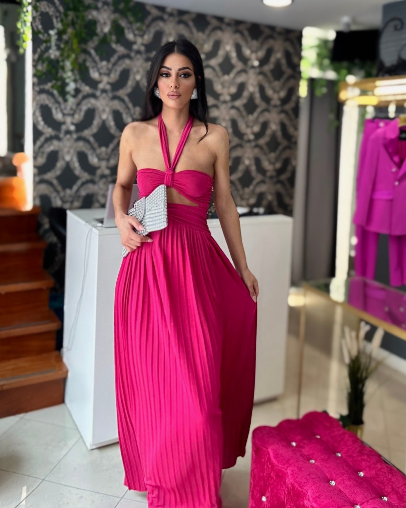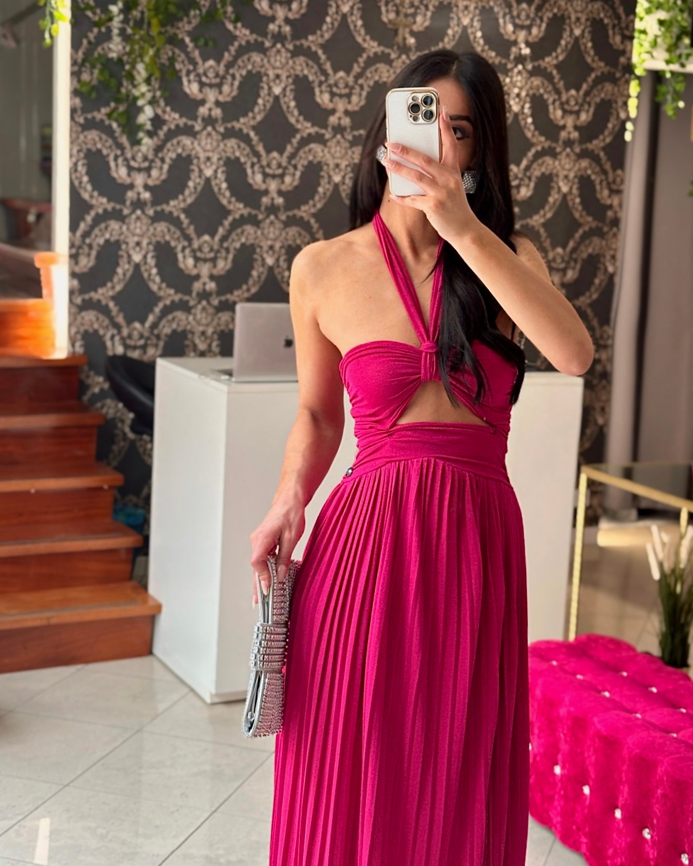 Abito lungo effetto lurex,cut out sulla parte frontale e gonna plissettata con spacco.