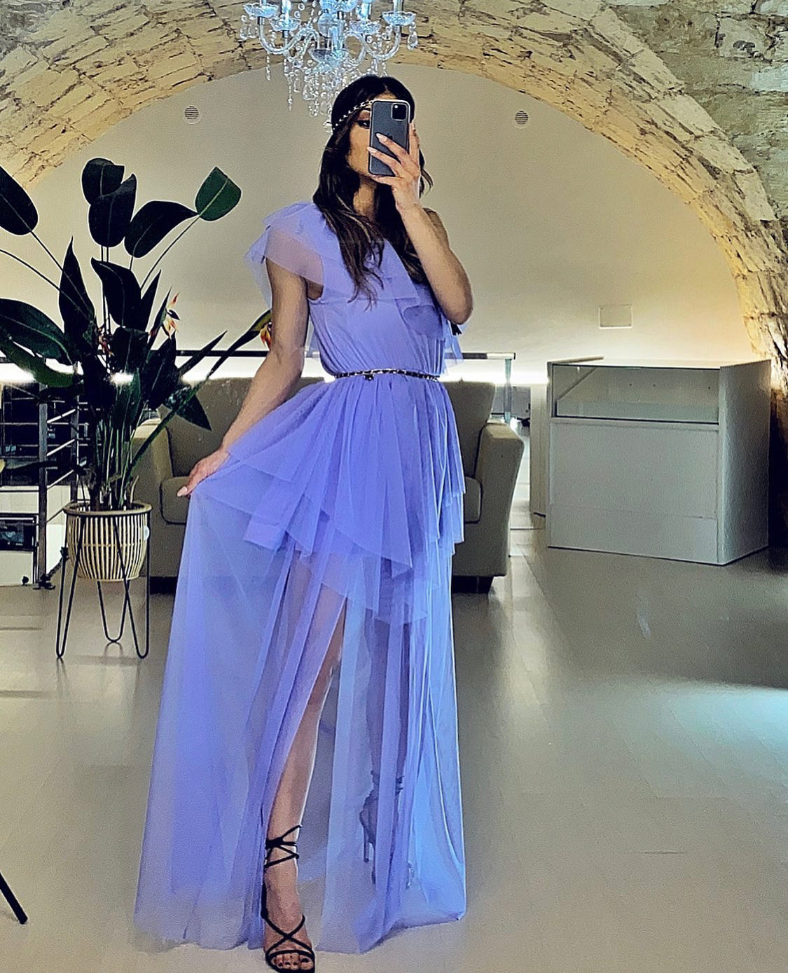 Abito lungo mono spalla con balze sullo scollo,elastico in vita e gonna asimmetrica.