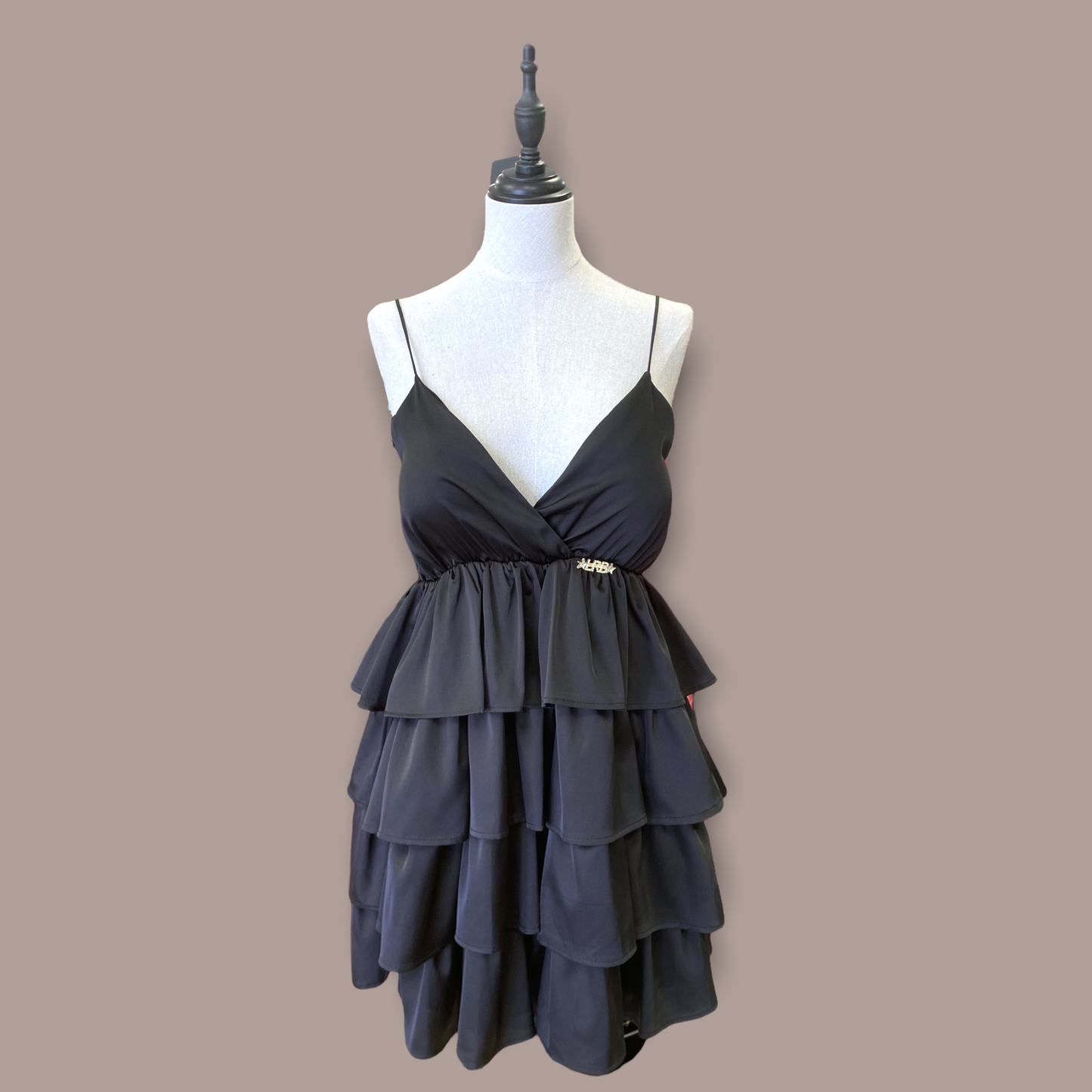 Mini abito nero con scollo a V,spalline sottili,coppe performate,elastico in vita,balze sulla gonna e spilla inclusa.